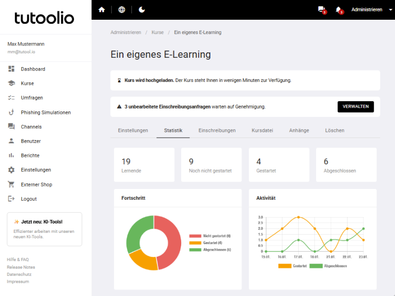 - Übersichtliche Dashboards: Verfolgen Sie den aktuellen Schulungsstatus live auf Personen-, Gruppen- oder Organisationsebene.