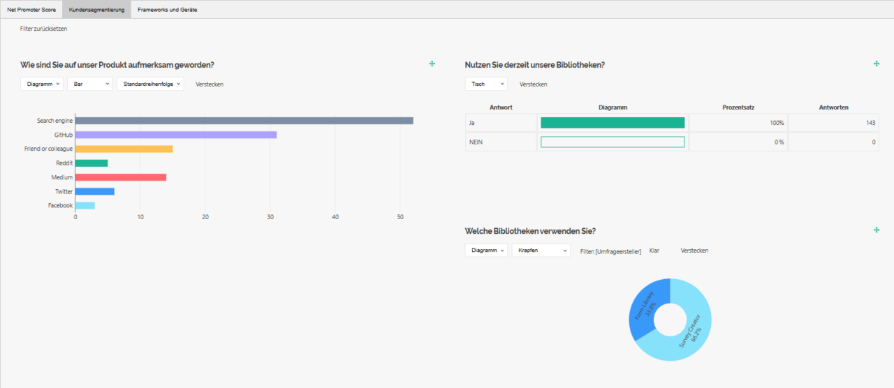 Visuelle Dashboards: Die Ergebnisse werden in übersichtlichen Grafiken und Diagrammen dargestellt, um Trends und Schwerpunkte sofort erkennbar zu machen.